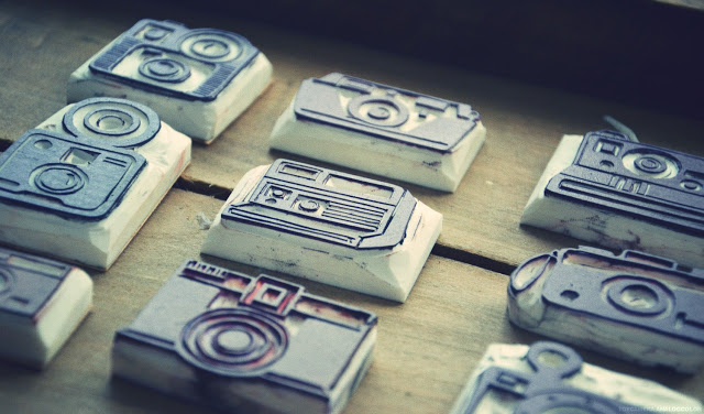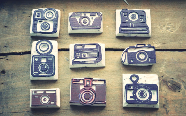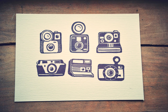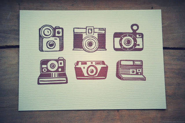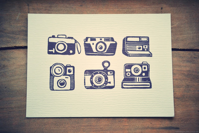 je suis fan des anciens appareils photos, j'en ai fait en tampons, mais ce qui est particulièrement sympa, c'est surtout de les voir en série. Comme il n'est pas toujours facile d'en avoir plein d'un coup pour ceux qui aiment aussi, j'en ai donc fait une petite dizaine et je les ai mis sur des cartons en format A5 pour les encadrer. Je vends quelques originaux dans la boutique. Mais je prévois d'en faire plus, sur des feuilles cartonnées de différents couleurs pour les amateurs.