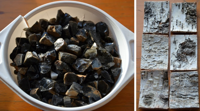 - Écorces de bouleau (Le bouleau pousse sur les friches "industrielles" ce qui explique le choix de cet arbre dans la mosaïque. L'idée est de garder la thématique couleurs / arbres / matériaux, pour obtenir une unité dans la réalisation de ce projet.