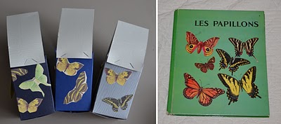 Monter les nichoirs, puis j'ai scanné des papillons dans un livre trouvé en brocante (édition des deux coqs d'or). Je les ai découpé et collé sur l'ensemble des nichoirs.