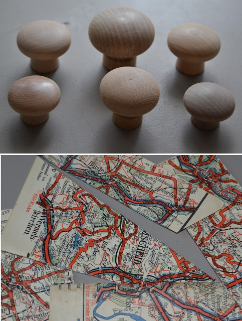 Un peu d'imagination, à l'aide de simple boutons en bois premier prix, des vieilles cartes routières et un peu de peinture rouge ...