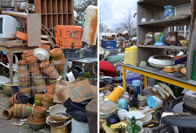 La vue de l'extérieur est étonnante, presque hallucinante il faut le dire. Quand nous sommes arrivés la première fois, les grilles étaient fermées et on a attendu à l'extérieur en se demandant si nous étions au bon endroit. Certes la vue ressemblait bien à du bazar de brocante mais alors quel bazar. Un fatras d'objets, de vieux meubles ayant pris la pluie et le gel tout l'hiver à l'extérieur. Je n'avais qu'une hâte : que les portes s'ouvrent.