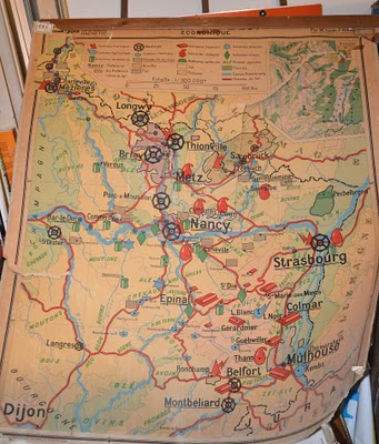 Une ancienne carte scolaire de Lorraine en mauvais état (elle est déchirée même si sur la photo ça ne se voit pas beaucoup). Etant originaire de Lorraine j'étais tellement ravie que la patronne m'a offert la carte. C'est pour situer la gentillesse de la maison.