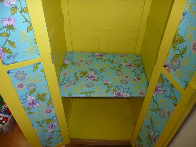 Je l'ai bien nettoyé et repeint dans une couleur tonique. C'était pour la chambre de grand-bonhomme qui a choisi la couleur et le tissu (certes je lui faisais choisir dans un choix de 3-4 tissus assortis à la couleur, certains plus connotés garçon mais il adorait les fleurs).
