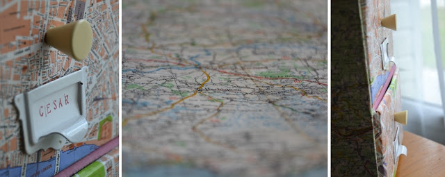 N'ayant toujours pas épuisé le stock de vieilles cartes routières, je les ai utilisées pour recouvrir la boîte. J'ai utilisé un plan de Londres pour les tiroirs. Les cartes ont été collées avec de la colle à papier-peints, j'ai passé une couche de colle-vernis sur la surface pour avoir un effet légèrement brillant.