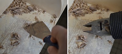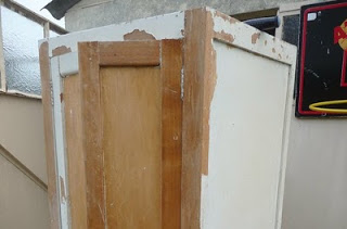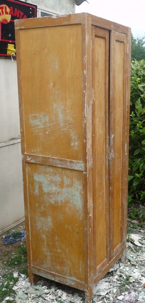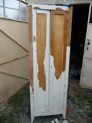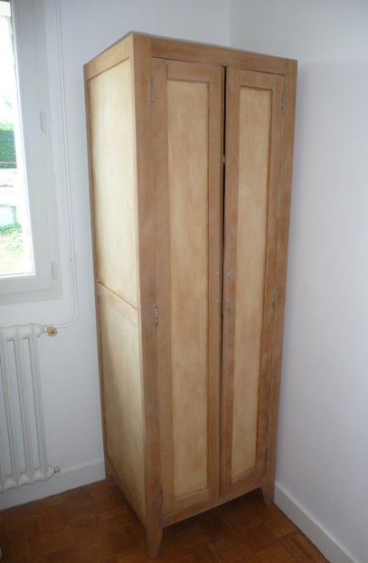 J'ai eu quand même pas mal de travail sur cette armoire, j'ai nettoyé au décapeur thermique avec une spatule en fer, puis poncé quelques heures à la ponceuse électrique.