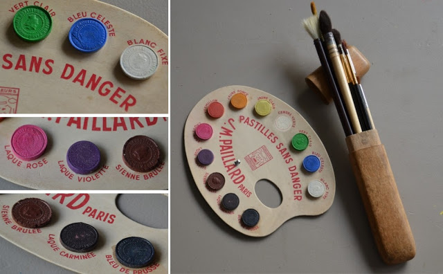 Voici une palette ancienne de couleurs estampillée J.M. Paillard. On apprécie le détail jusque dans le relief sur les pastilles de couleur. La palette est en bois, et il y avait probablement un petit pinceau dans le clip en métal.
