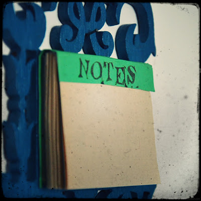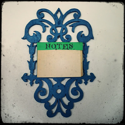 Avec le porte-allumettes en bois chantourné chiné il y a quelques semaines, j'ai fait un petit pense-bête pour la cuisine en réutilisant des pages d'un ancien cahier, que j'ai agrafées.