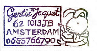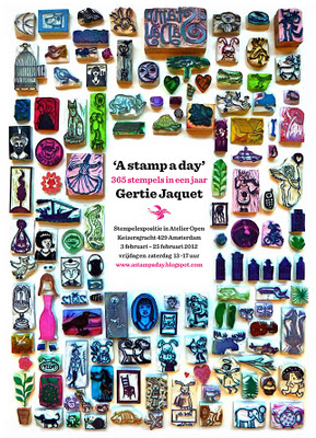 Pour connaître tout ceci, je me suis intéressée aux personnes qui font des tampons, j'ai ainsi découvert la semaine dernière, le travail de l'illustratrice Gertie Jaquet, néerlandaise, vivant à Amsterdam. Elle a réalisé un blog magnifique "a stamp a day" autrement dit un tampon par jour. En 2011, elle a donc gravé un tampon par jour, et a fait une exposition de ses tampons, qui est actuellement en cours à Amsterdam.