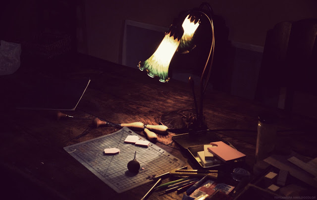 Au Japon, il existe des dizaines de gommes à graver différentes, des blanches mais aussi de couleurs, de différents degrés de dureté, le paradis en quelques sortes. (Il y a même une association qui regroupe les professionnels de gommes gravées à la main !!) mais pas d'envoi international pour tout cela. Je trouve ma gomme dans une librairie japonaise JUNKU à Paris.