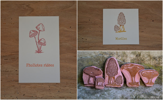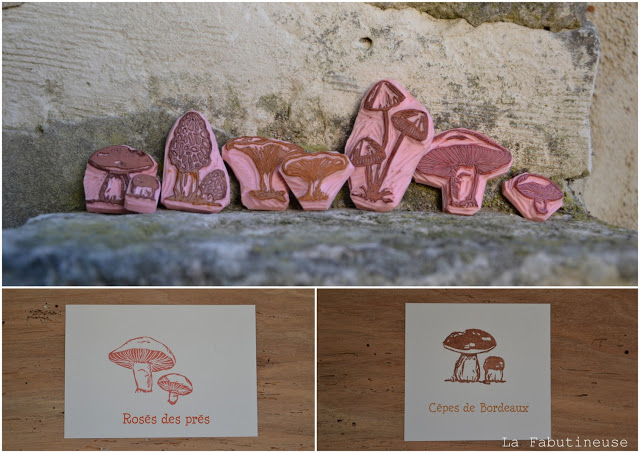 Nous avons voulu aller aux champignons. je me disais qu'avec une pluie éparse et de la chaleur, on allait trouver des cèpes, ou même des girolles. Manque de chance, nous avons fait une grande balade en forêt, mais nous n'avons rien trouvé. Rien de rien. Du coup je me suis rabattue sur mes gouges et j'ai gravé une petite série de champignons en tampons. Prémices d'une série qui sera probablement en boutique à la rentrée :)