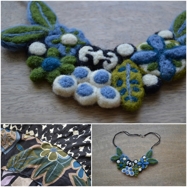 Je vous avais déjà parlé de Patricia, ou "la sauterelle verte" qui réalise des bijoux en laine cardée. Dire que j'adore est peu dire, j'aime d'une folie douce les bijoux qu'elle réalise. Je lui ai demandé de me faire une série de bijoux sur mesure, d'après des motifs de mes vêtements, pour assortir quand je les porte. je lui ai fait des dessins et elle a réalisé les bijoux d'après mes dessins.