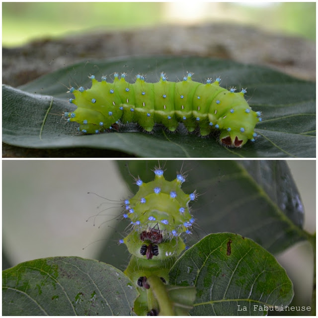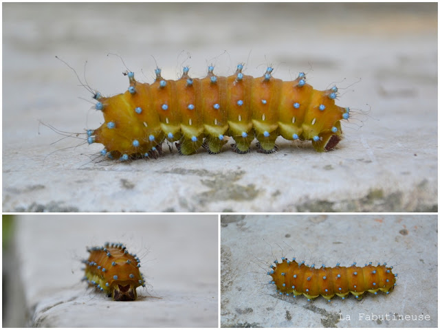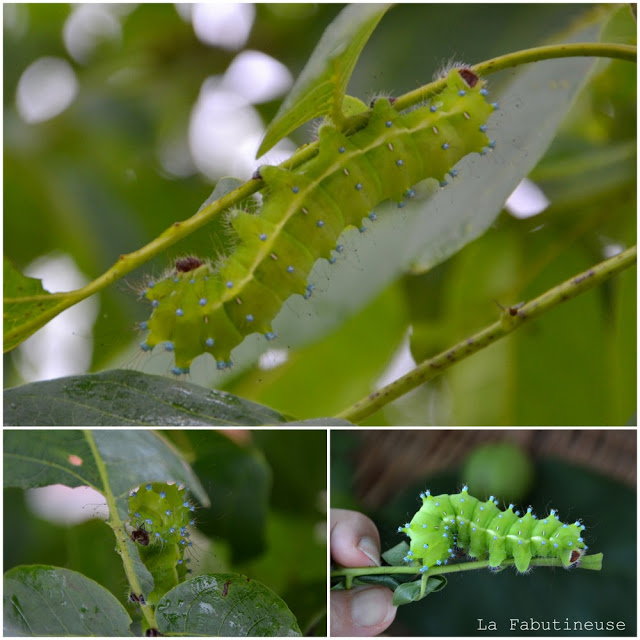 C'était une chenille magnifique comme je n'en avais jamais vue. Au moins 8-9cm de longueur, sur 1,5cm de diamètre. Quelques recherches plus tard, nous savions que c'était la chenille de Saturnia Pyri le plus grand papillon de nuit d'Europe.