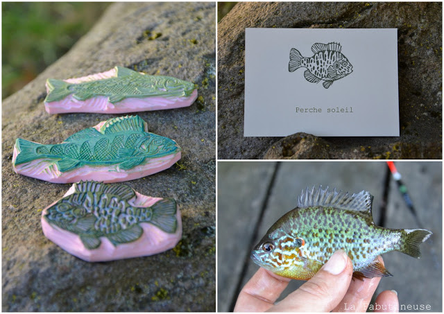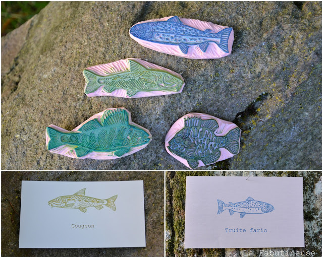 Durant les vacances nous avons été pêcher dans la Vienne, j'avais pris pour l'occasion une carte de pêche spéciale vacances. C'est avant tout pour occuper les enfants, car en guise de matériel nous n'avons que des cannes à pêche simples, pas de moulinets ni de pêche à la mouche. On a pêché des petits poissons quand même. Une belle perche soleil !! Du coup comme j'avais déjà fait des poissons en tampons cette année, j'ai continué la série avec d'autres poissons. Gougeon, perche commune, perche soleil...