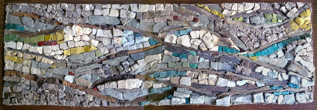 laetitia Gauthier. Ce travail a été réalisé en quelques heures, à base d'écorces de bois, d'ardoise grise et verte, de marbres et de pâtes de verre de venise. J'ai toujours aimé les couleurs avec une grande curiosité pour les naturelles, issues de la terre des plantes des pierres. Les dégradés de jaune vert bleu de la pâte de verre m'ont fait succomber à l'attrait de la mosaïque. ne maîtrisant pas la technique, je me suis formée par la suite sur plusieurs jours.