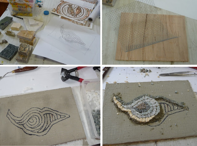 Dans la foulée de l'article précédent, voici quelques images du stage de mosaïque romaine effectué l'été 2010 avec Lætitia Gauthier. Ce stage "Copie d'un détail de mosaïque romaine en méthode directe" était sur 2 jours complets. Soit 20 heures presque non stop.