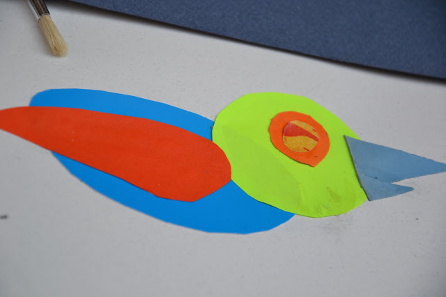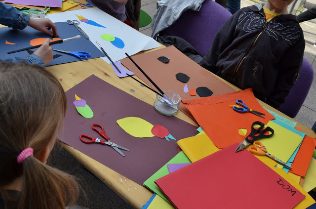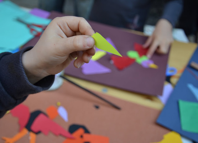 Le thème printanier choisi pour l'atelier, était les oiseaux, et pour cela un peu de récup et de l'imagination étaient seulement nécessaires ... Des tables sorties dans la rue, des vieilles pochettes colorées récupérées dans le bac à papier de mon boulot, des petits doigts de la colle et hop, des enfants ravis ...