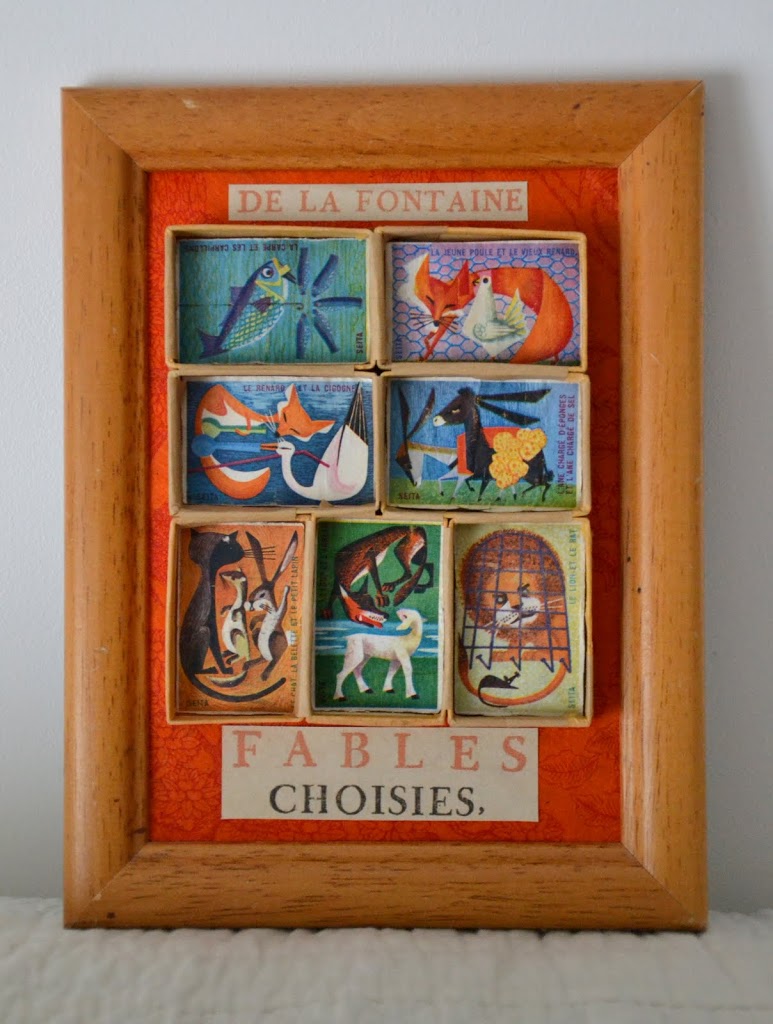 Le Flibustier avait depuis des années gardé des anciennes boîtes d’allumettes Seita sur le thème des fables de La Fontaine. Chaque illustration était super mignonne, mais comme il n’en faisait pas grand chose à part les avoir dans un coin, il me les a données, en me disant que j’en ferais sûrement quelque chose …