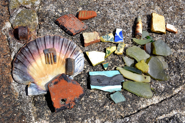 Petit méli-mélo de trouvailles ramassées à marée basse dans le port de Locmariaquer, petit poisson en mosaïque sur le granit du chemin de passage où nous avons passé quelques heures à profiter simplement de la vue. J'ai pris tous les morceaux et j'aimerai bien refaire ce petit poisson sur un morceau de bois pourquoi pas ? Me voilà avec une chouette idée à faire avant la rentrée ... A suivre donc :)