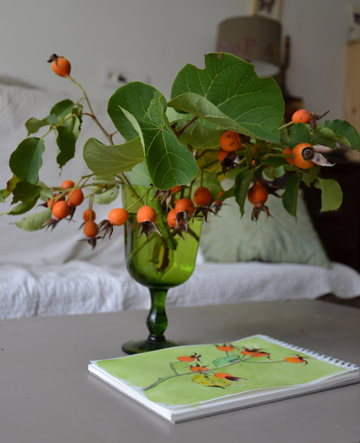 Voilà, j'ai tenté de reprendre les pinceaux, une petite aquarelle tout simple pour débuter. Des fruits des rosiers du jardin, qui ont poussé faute d'avoir taillé quand il le fallait. Mais ils étaient les bienvenus pour cette reprise. J'ai regretté ensuite d'avoir fait le fond vert, ça affadit le dessin. Mais j'ai tout le loisir de refaire des essais maintenant que je m'y remets doucement :)