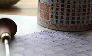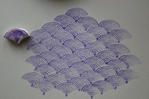 Alors, c’est drôle parce que je viens de quitter le blog de Cécile (Facile Cécile) où elle parle de boutis, et là, avec tes tampons japonisants, j’imagine tout à fait une mèche de coton à passer entre les lignes, ça donnerait un joli motif. J’adore le violet !