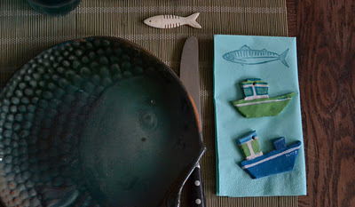 Une petite serviette en papier assortie, les petits bateaux sont en argile peinte, cela peut faire de jolis porte-couteaux.