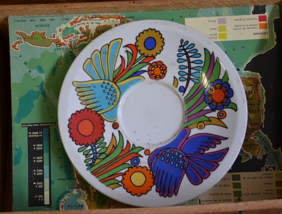 Une petite assiette de service Acapulco de Villeroy et Boch, derrière on aperçoit une ancienne carte qui est un dépliant intitulé "le monde en couleurs" conception et réalisation par l'imprimerie Chaix (qui a fermé en 1975) je situerais ce dépliant entre les années 60 et 70 et plein d'autres choses que je vous présenterai bientôt hé hé ...