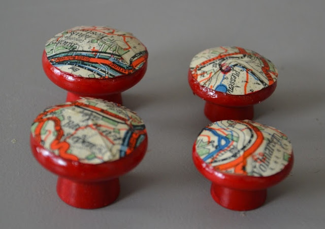 Un peu d'imagination, à l'aide de simple boutons en bois premier prix, des vieilles cartes routières et un peu de peinture rouge ...
