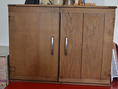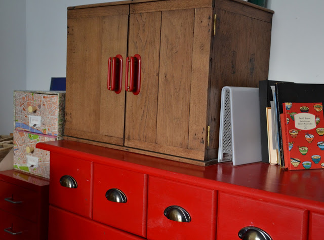 Avant, une petite armoire en chêne moyen, posée sur un meuble rouge. je n'aimais pas les poignées de métal.