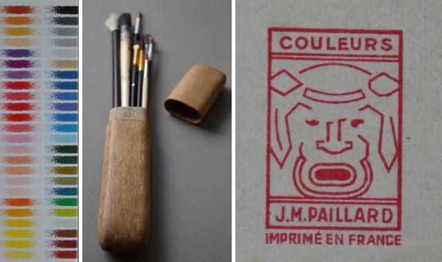 Voici une palette ancienne de couleurs estampillée J.M. Paillard. On apprécie le détail jusque dans le relief sur les pastilles de couleur. La palette est en bois, et il y avait probablement un petit pinceau dans le clip en métal.