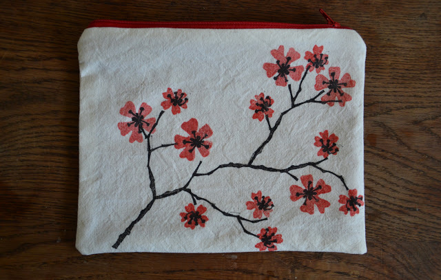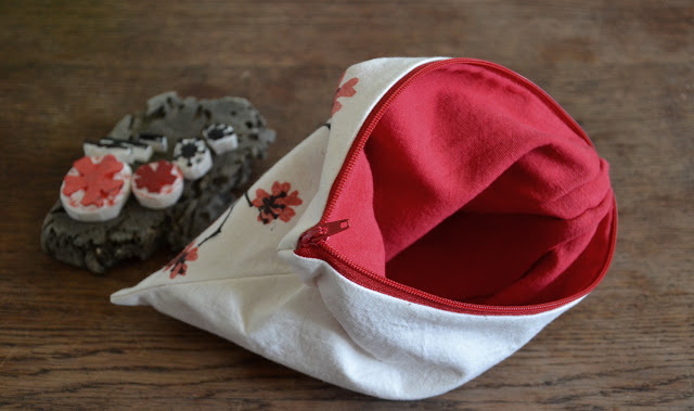 Ci dessous un essai série "Fleurs" - Cerisier japonais, en petite trousse, doublée de lin rouge vintage, (chiné). Je précise qu'il s'agit d'un essai, car il y a encore des petites choses à régler.