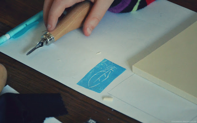 Au programme, réaliser des tampons gravés de deux façons différentes : dans le bloc de tampon graver le motif, ou évider et faire ressortir un motif (ce que je réalise moi-même pour mes tampons).