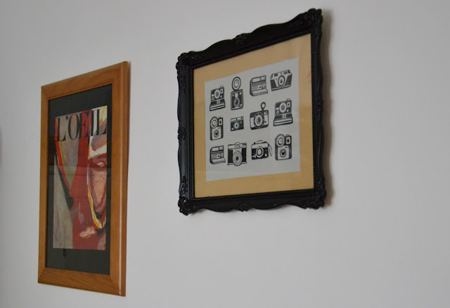 J'ai quand même encadré mes appareils photos en série, pour cela j'ai repeint un cadre en plastique kitch, que j'avais utilisé au départ pour mes poissons. Finalement un petit coup de peinture noire en bombe plus tard, le voilà parfaitement adapté pour les appareils photo vintages.