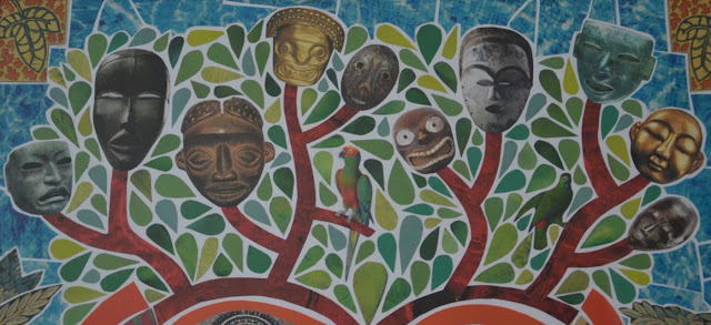 Chaque feuille est une goutte découpée, quel travail. On aperçoit de jolis oiseaux dans les branchages-cheveux ainsi que des masques ethniques.
