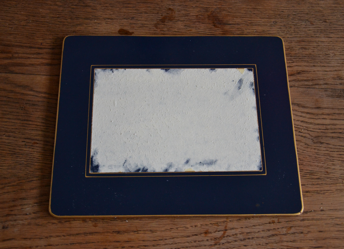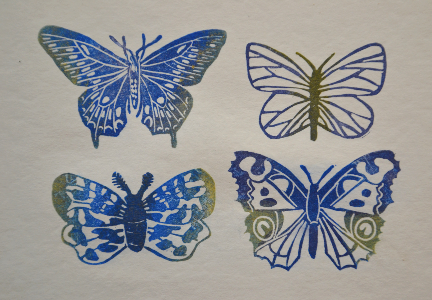 J'ai enlevé l'image collée dessus, puis je l'ai remplacée par la série de papillons, en mettant deux encres bleues différentes ainsi qu'un peu d'encre dorée de ci de là.