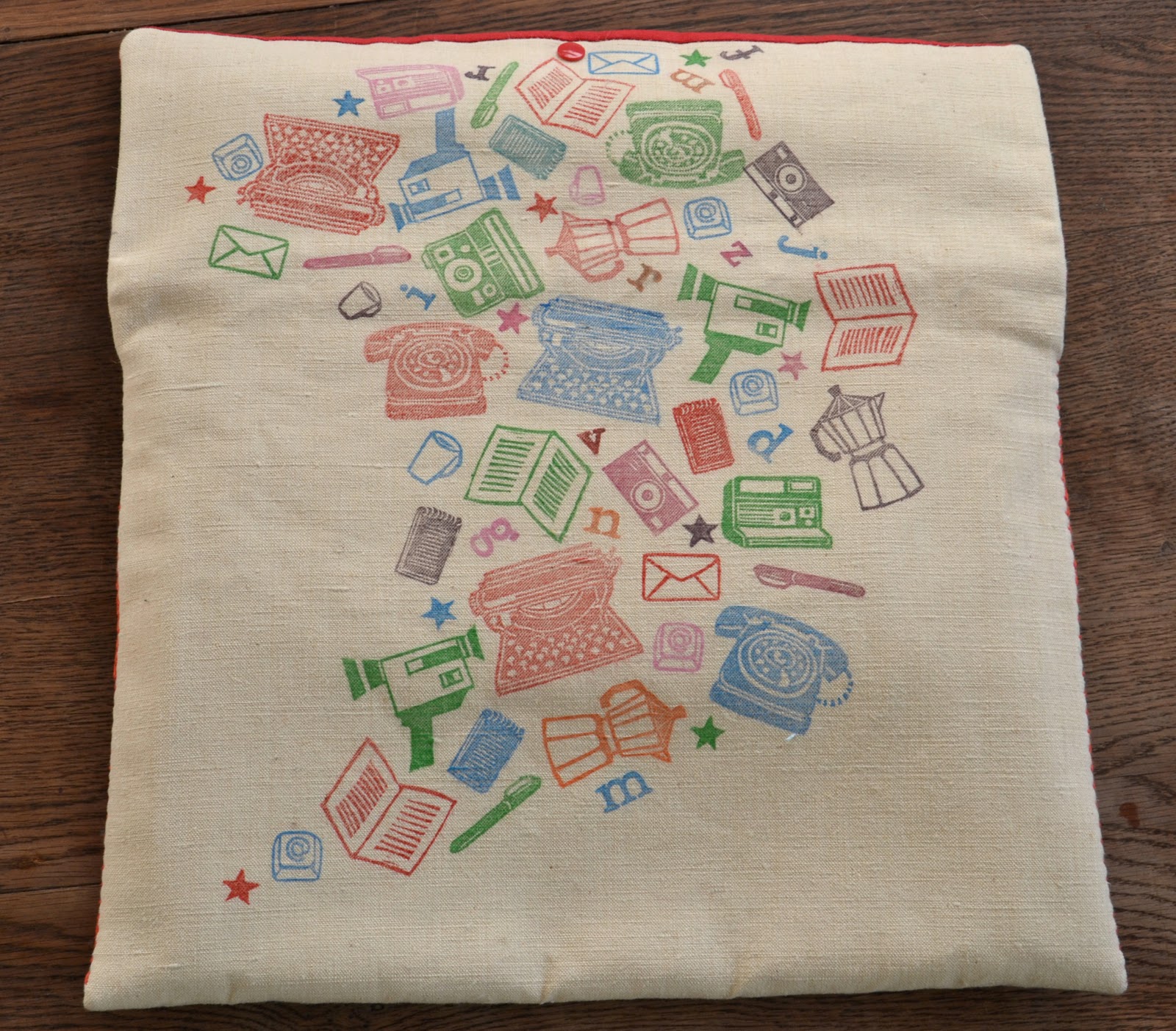 Et j'avais l'idée de tamponner ces objets en représentation vintage. J'ai donc utilisé la machine à écrire, les appareils photos vintages, le téléphone, et d'autres objets : stylo, carnet de notes, livre, camera super8. J'ai utilisé aussi des lettres d'un alphabet que j'ai aussi gravé.