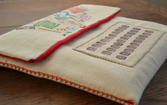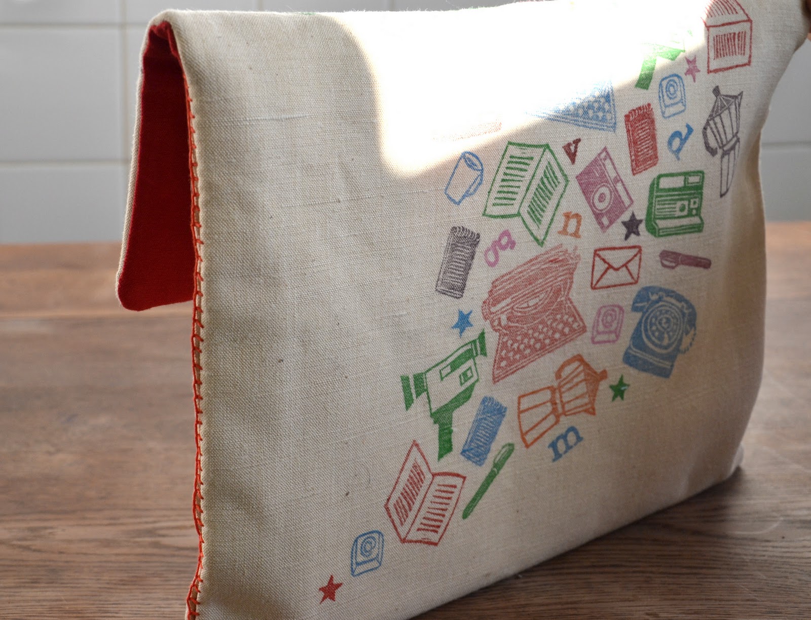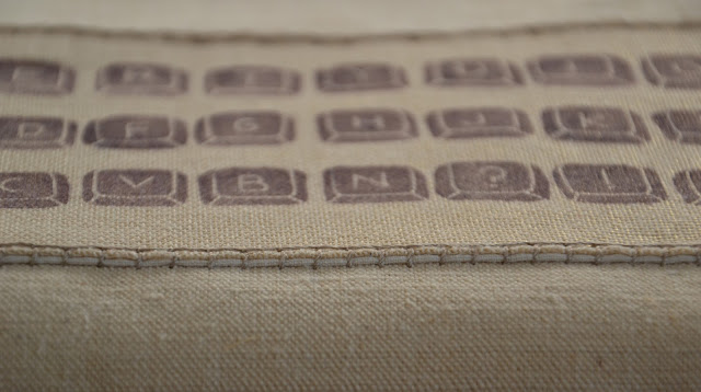 Toutes les encres sont des encres spéciales pour tissus. Les matières : Des tissus vintage chinés. Il y a du lin (ou chanvre) très très épais, (probablement utilisé pour recouvrir des fauteuils car il tient très bien), du lin rouge épais pour la doublure. J'ai beaucoup hésité à utiliser un tissu à motif vintages, mais avec les motifs extérieurs l'uni s'imposait. Et le clavier a été imprimé sur un lin aux reflets dorés, il a été d'abord cousu à part, puis brodé-cousu à point visibles avec un fil de soie ancien.