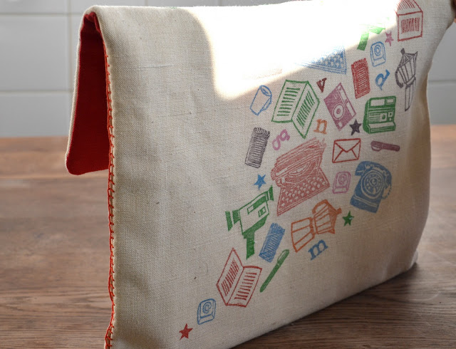 Il y a en plus entre les deux tissus, une doublure de coton molletonné très épais (qui provient d'anciennes alèses de lit bébé) pour protéger l'ordinateur. Donc cela faisait beaucoup d'épaisseur, je ne pouvais la coudre avec la machine. Pour fermer la housse j'ai donc utilisé un fil épais de coton vintage rouge, avec les mêmes points que ceux du clavier.