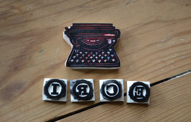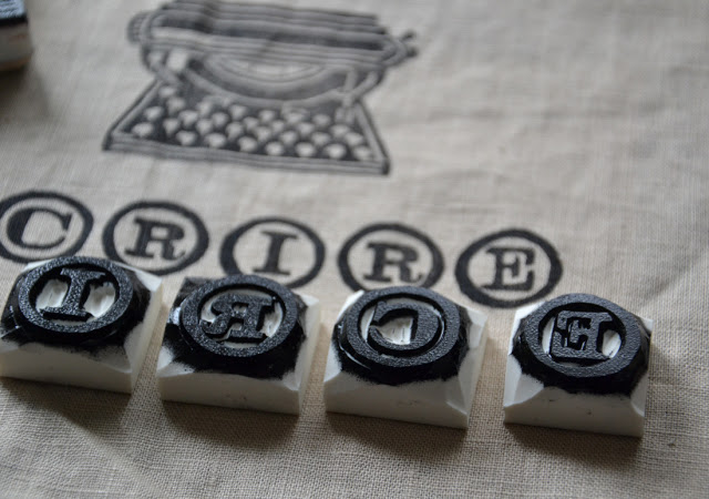 Petits tampons "touches de machine à écrire ancienne", et machine à écrire.