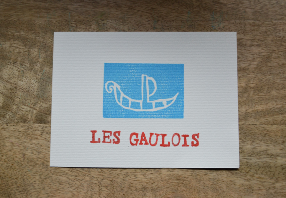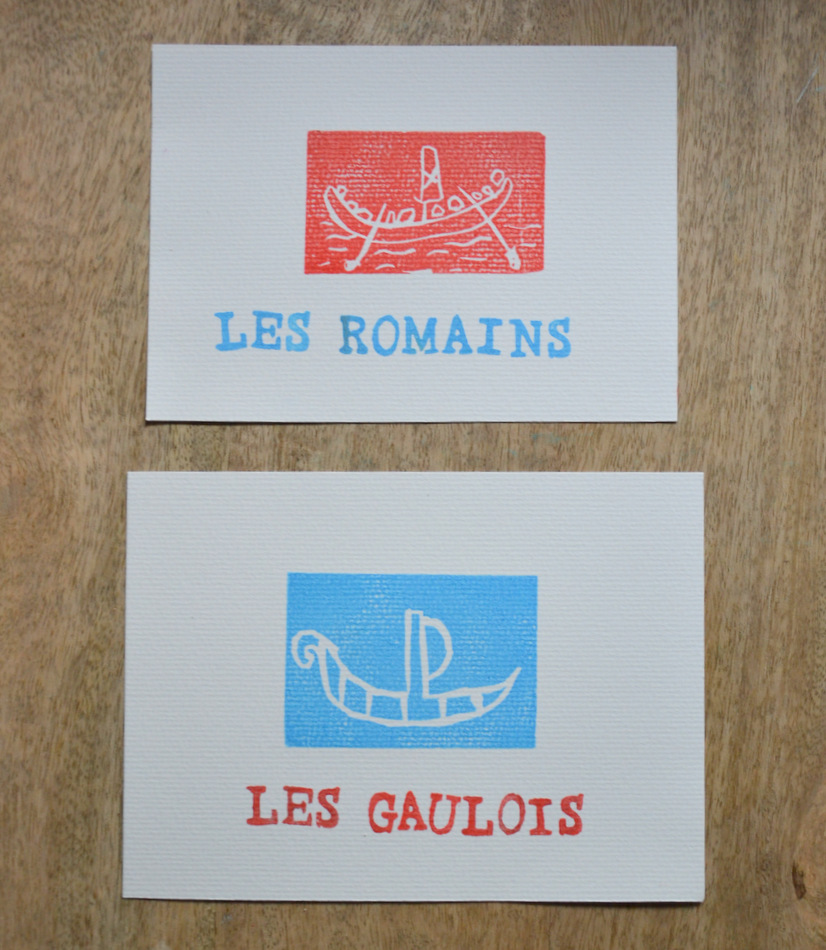 Quelques photos des tampons des enfants, de temps en temps ils ont envie de graver « comme maman ». Je dois quand même constater dans ces moments là que le plus petit ne se freine pas dans l’inventivité. C’est lui qui avait déjà eu l’idée (tout seul) de faire des poissons. Là sans que je le guide, il a voulu faire un bateau. Il donc dessiné sur la gomme (sans modèle mais où trouve-t-il l’imagination?) avant de prendre les gouges et hop hop quelques coups sûrs, est apparu un chouette bateau « romain » m’a-t-il dit.