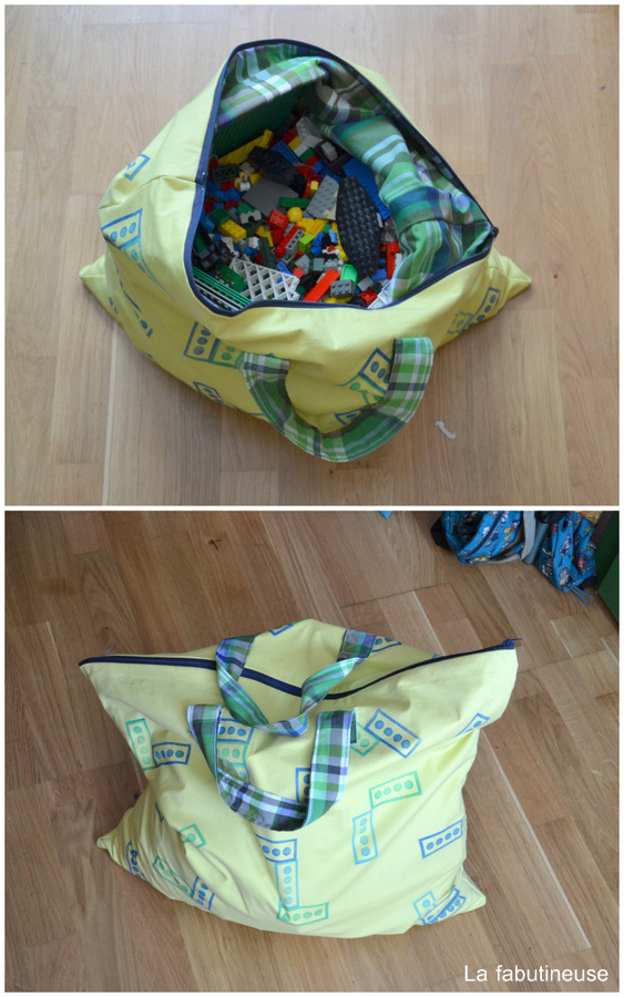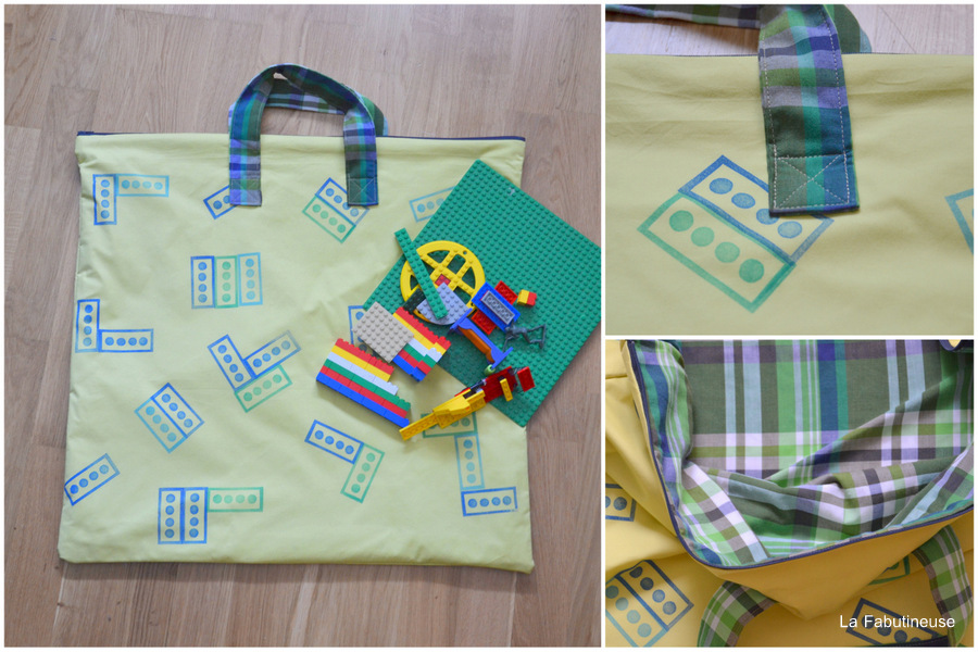 Voici donc un sac de rangement de Legos, qui se ferme avec une fermeture éclair de 60 cm de long. Je voulais au départ faire un tampon qui ressemblerait à un Lego, hum en fait ça ne fait pas vraiment à ça, mais finalement j’aime le motif graphique que j’ai décliné en plusieurs couleurs, pour assortir avec la doublure choisie. Un coton à carreaux. J’ai cousu des poignées pour faciliter le transport. Je crois qu’avec ça, nous sommes parés.