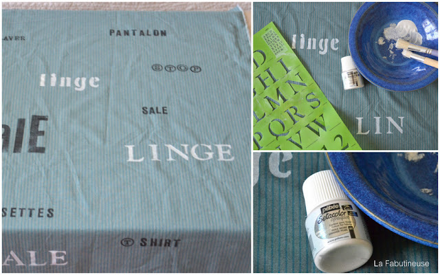 J'ai d'abord tamponné des mots à l'encre noire avec des tampons gravés à la main, mais aussi des lettres d'imprimerie en bois. J'ai aussi utilisé un pochoir alphabet avec de l'encre tissus légèrement moirée brillante.