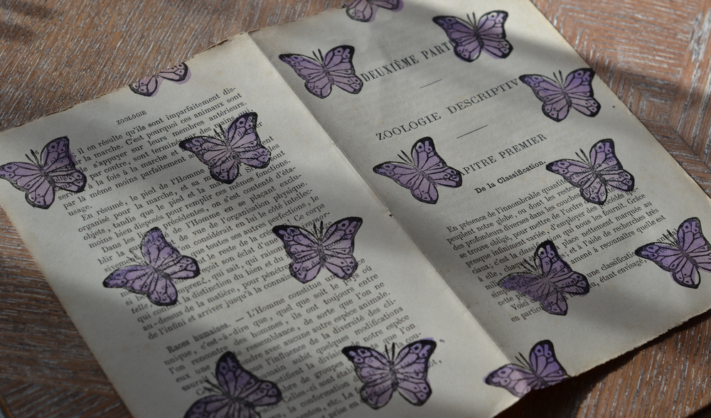 Comment faire un emballage cadeau original et surtout vite-fait. J’ai pris une ancienne page d’un vieux livre que j’utilise pour cela. Un tampon papillon en deux parties, une partie pour la couleur du fond et une partie pour les détails.