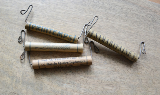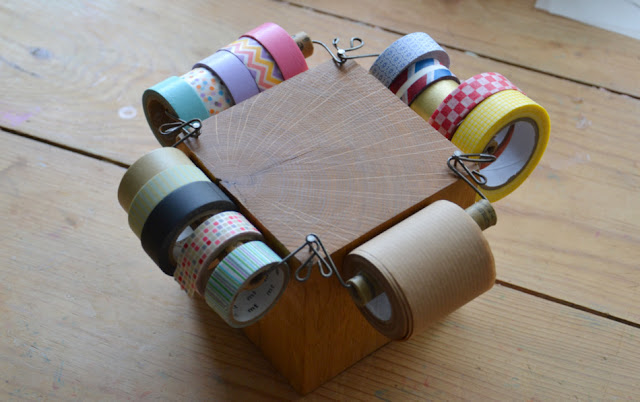 D'un point de vue organisation de mon bureau/atelier, je cherche depuis un moment une façon d'avoir à portée de main mes rouleaux de masking tape, sans que cela ne me prenne trop de place. J'ai bien vu de superbes dérouleurs en bois, mais s'il en faut un par rouleau ça coûte vite un bras, j'essaye toujours dans la mesure du possible de trouver des idées qui privilégient la récupération / brocante / réutilisation. je pourrais dire dans un souci de déconsommation, mais disons que je suis motivée avant tout par la question économique. J'essaye de ne pas acheter ce qui peut être bricolé. En plus ça donne une touche originale dans la maison.