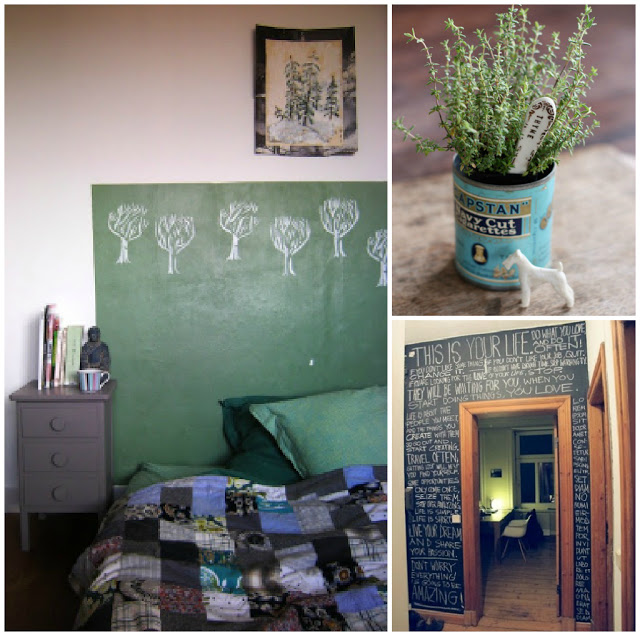 Une très bonne idée cette tête de lit peinte (et changeante selon l'envie), j'aime cette frise d'arbres. Cette idée a été piquée chez Lathelize. Un peu de verdure dans la maison dans cette belle boîte vintage. Et puis j'aime aussi cette entrée ou couloir peinte avec de la peinture pour tableaux qui permet de laisser s'exprimer toute créativité.