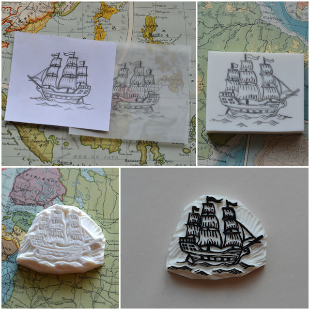 Comme le Flibustier a cette capacité à dessiner ces voiliers quasi les yeux fermés (dû aux nombreuses illustrations qu'il a faites sur ce thème), je lui ai demandé de m'en dessiner un à graver. C'est donc une création à deux mains et beaucoup d'amour :), qui a vu le jour dans la gomme.