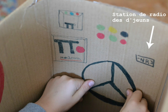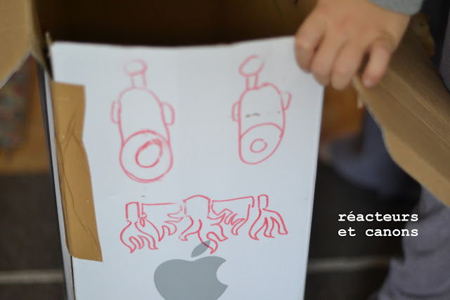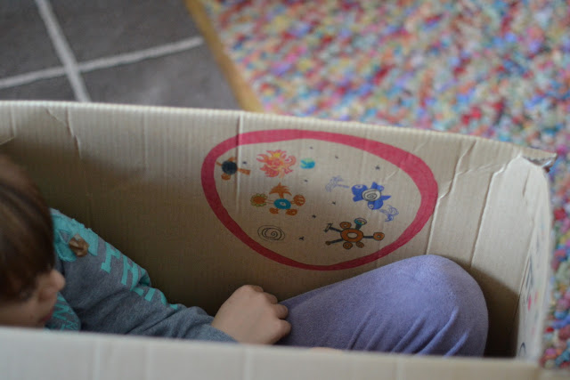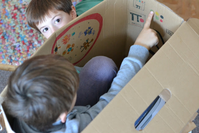 Quand il ne fait pas beau dehors et qu'il fait froid, j'entends souvent mes garçons demander "on peut regarder la télé ?" Alors certes ce serait plus facile de dire oui, mais comme je travaille dans le séjour, je dis aussi souvent non. Après les soupirs et râleries d'usage, ce qu'ils font ensuite est souvent bien plus chouette. Dernièrement, ils ont investi le carton dans lequel est arrivé mon petit meuble orange la semaine dernière, et y ont imaginé un vaisseau spatial qui aurait été loin dans la galaxie. Tellement loin que de la petite fenêtre dans le vaisseau on aperçoit la terre en tout petit, et les diverses planètes rencontrées.