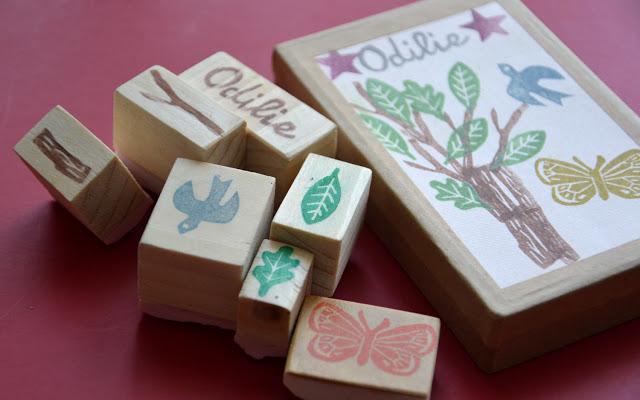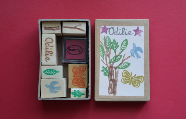Grand bourdon était invité à l'anniversaire d'une copine la semaine dernière. J'ai pensé expérimenter une idée que j'avais depuis un petit moment, faire une petite boîte avec différents tampons.