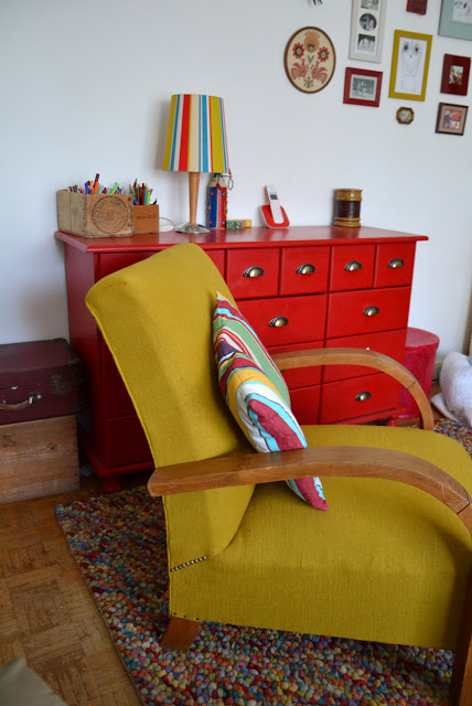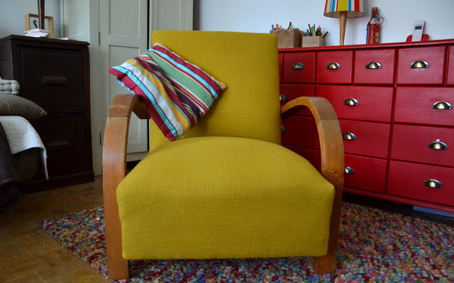J'avais trouvé il y a quelques mois un gros rouleau de tissu d'ameublement en brocante, et il a été utilisé pour refaire le fauteuil.