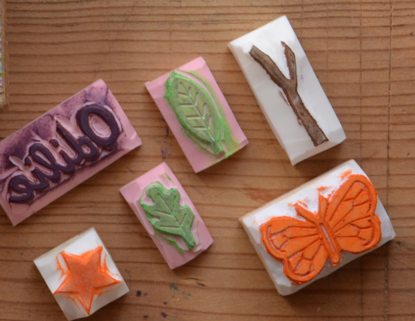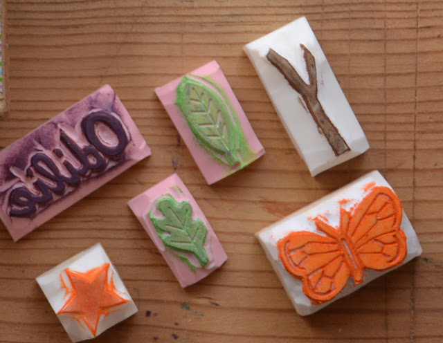 J'ai utilisé des morceaux de bois plus épais( 2cm) pour y coller les gommes gravées, car certaines étaient très petites pour des mains d'enfant.