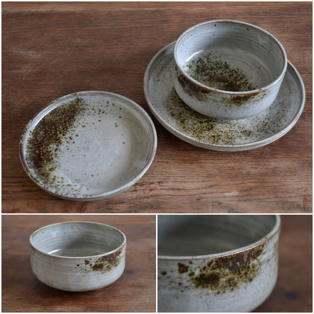 Et un service en grès fait à la main, je ne vous montre que le bol et deux assiettes (le service comptait 6 bols et les assiettes par 12), j'ai aussi un gros plat pour le four et un plat à cake rectangle immense. Je ne voulais que les bols et les assiettes plus grandes, mais même si je prenais juste la moitié le tarif était le même, je n'ai pas laissé grand chose, juste une cruche, un poêlon et un plat carré fendu. C'est du vrai travail artisanal comme je l'aime avec ses défauts et irrégularités entre pièces. Je vois bien des soupes au potimarron dans ces bols gris non ? Parce que du potimarron on va en manger pas mal cet hiver ... vous verrez bientôt pourquoi :)